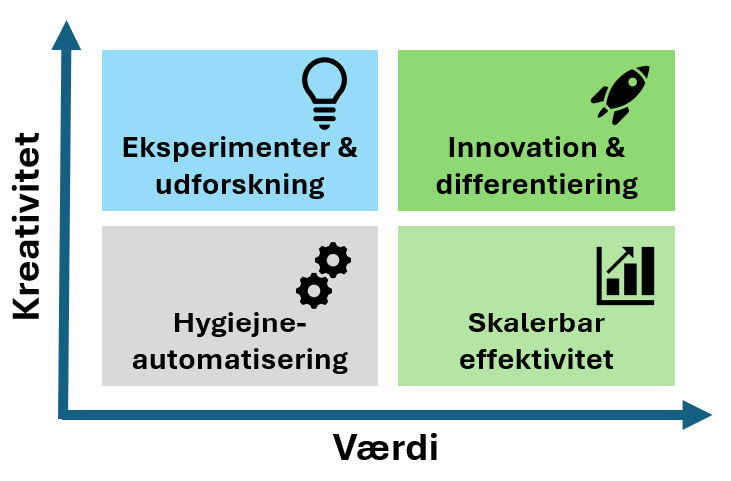 This is what we might call hygiene automation and minor (though often necessary) improvements. Standard summaries and simple email drafts. Rarely strategic, but useful for training, adoption, and building organizational comfort with AI – and for freeing up time for more innovative work. The key point is that investment and expectations should remain proportionate.